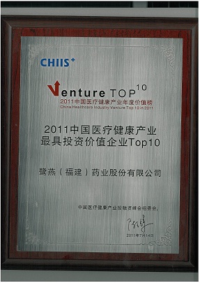 2011年7月14日,在北京舉辦的2011第五屆中國(guó)醫(yī)療健康產(chǎn)業(yè)投融資峰會(huì)上,鷺燕(福建)藥業(yè)股份有限公司榮獲“2011中國(guó)醫(yī)療健康產(chǎn)業(yè)最具投資價(jià)值企業(yè)TOP10”稱號(hào)。公司于2010年引進(jìn)建銀國(guó)際醫(yī)療產(chǎn)業(yè)基金等投資者近1.5億元投資后,在公司治理、經(jīng)營(yíng)業(yè)績(jī)、戰(zhàn)略布局等方面得到進(jìn)一步提升,鞏固了公司在福建省醫(yī)藥流通領(lǐng)域的龍頭地位。